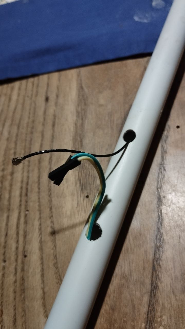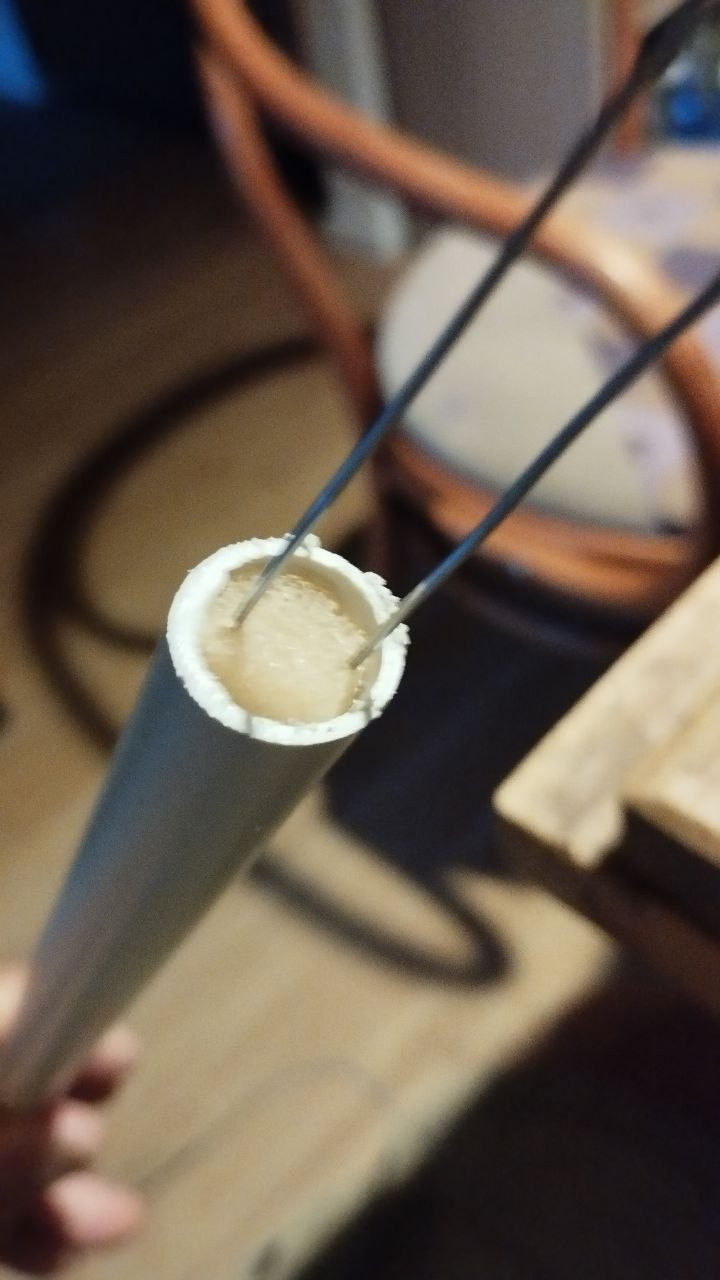 Tubo in PVC da 16mm, sufficiente per alloggiare una Jpole. Qui si vede anche una delle due spugnette che ho inserito alla base ed in cima per tenere i conduttori staccati dalle pareti interne: sembra che il fattore di velocità (e quindi la risonanza) cambino non poco se entrano in contatto.
