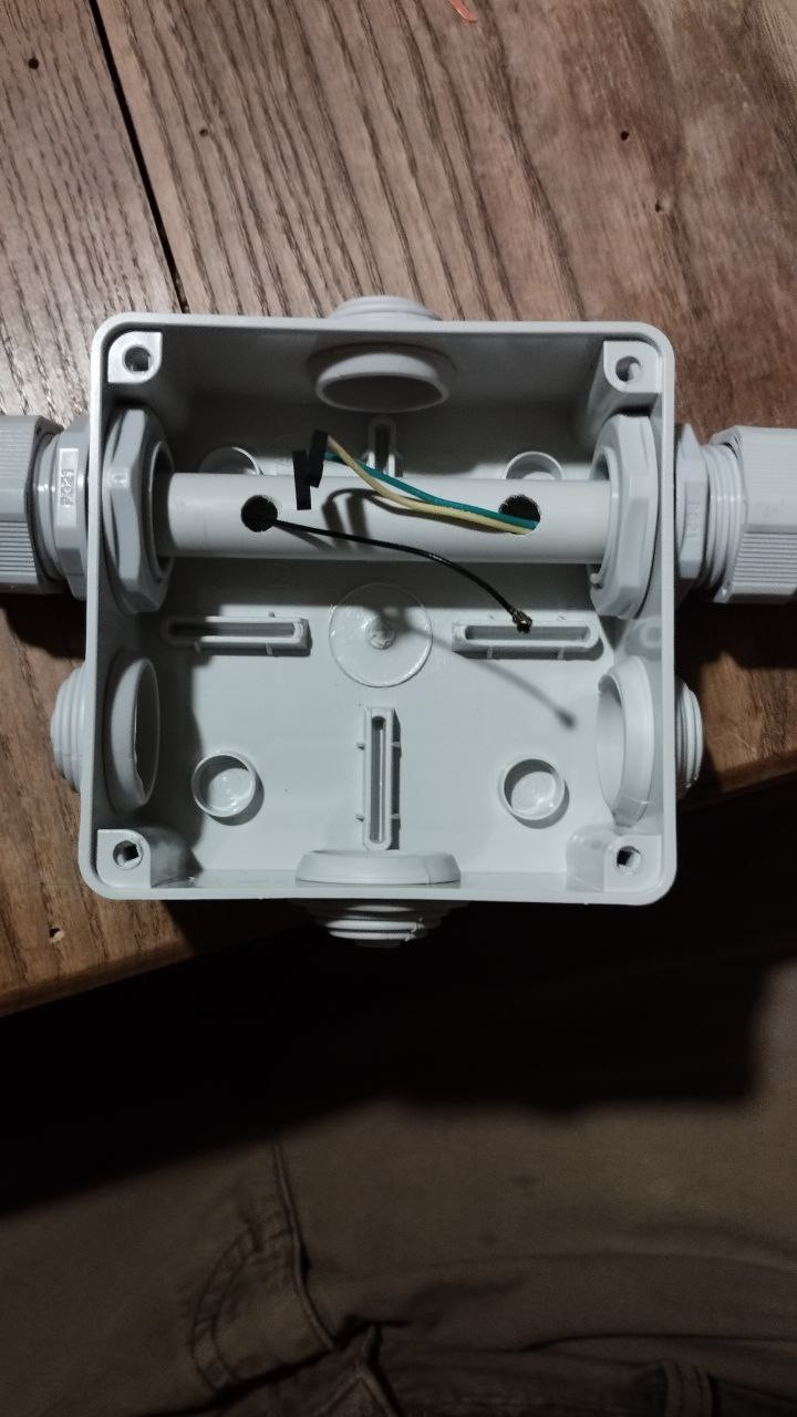 La soluzione con due pressacavi sembra quella che da più robustezza e praticità di assemblaggio. Gli altri tappi (o almeno quello superiore) andrebbero sostituiti con qualcosa di più adatto agli esterni (problemi nel tempo con UV?).