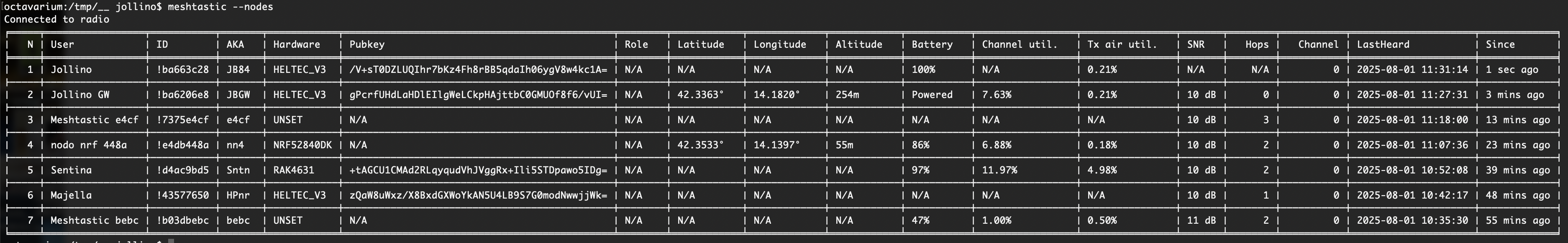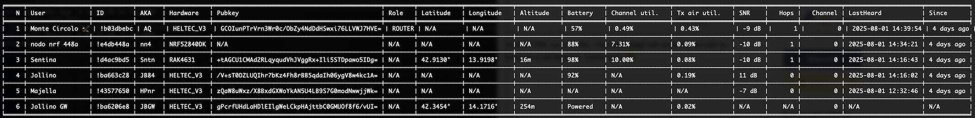Ho anche riattivato il mio nodo "interno", e sta cominciando a ricevere la lista dei nodi pure lui. I messaggi che invio però non arrivano per niente su Telegram, probabilmente per l'hop in più; ho anche provato a impostarlo a 4 invece che 3, visto che l'unico nodo diretto che vedrà mai è quello che sta fuori, ma non trasmetto e non ricevo. O meglio, l'ack c'è (presumo da parte di quello esterno), ma all'atto pratico ricevo solo i nodeinfo e la telemetria degli altri nodi. Dopo un'oretta stanno iniziando a popolarsi anche le coordinate: